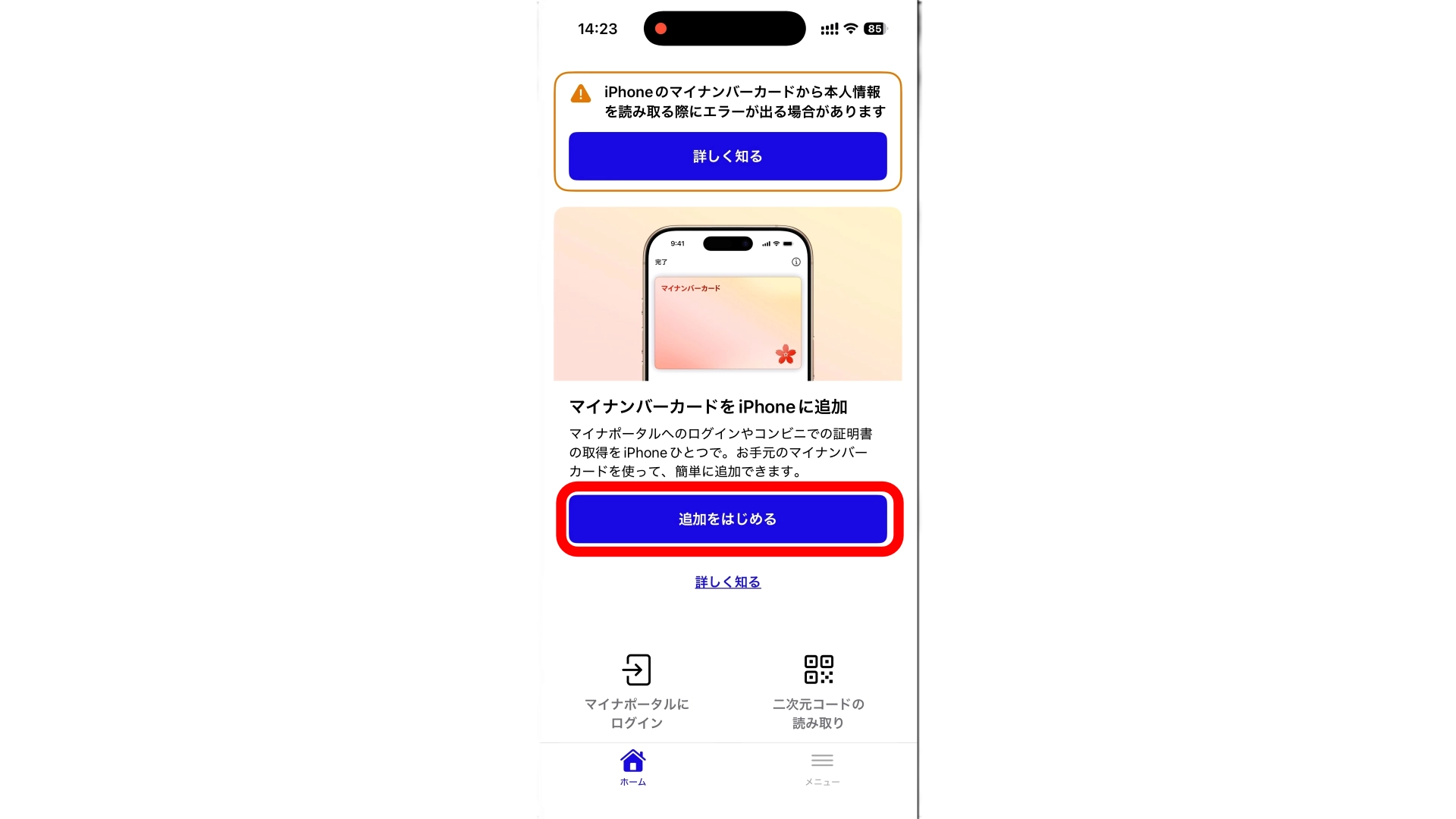 マイナポータルアプリを開き「追加をはじめる」をタップ