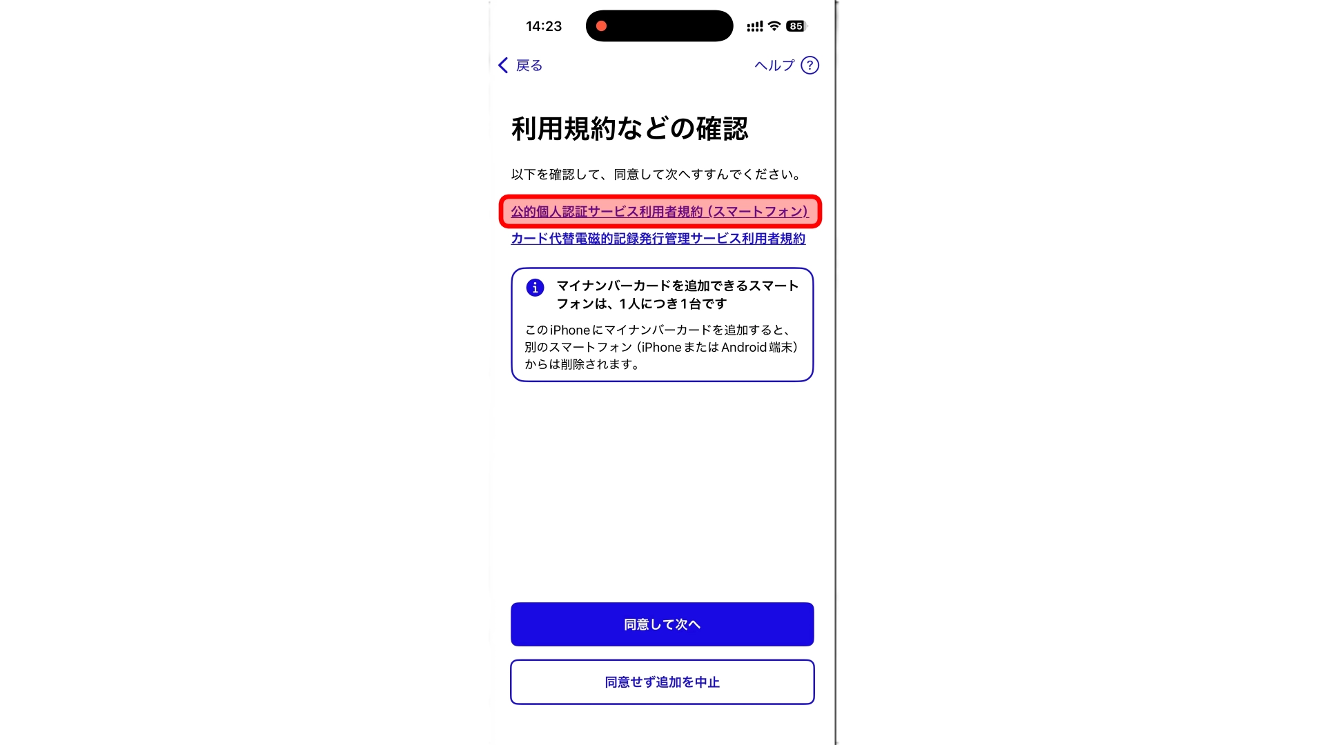 利用規約などの確認をします。下の図の赤の部分をタップして確認します。