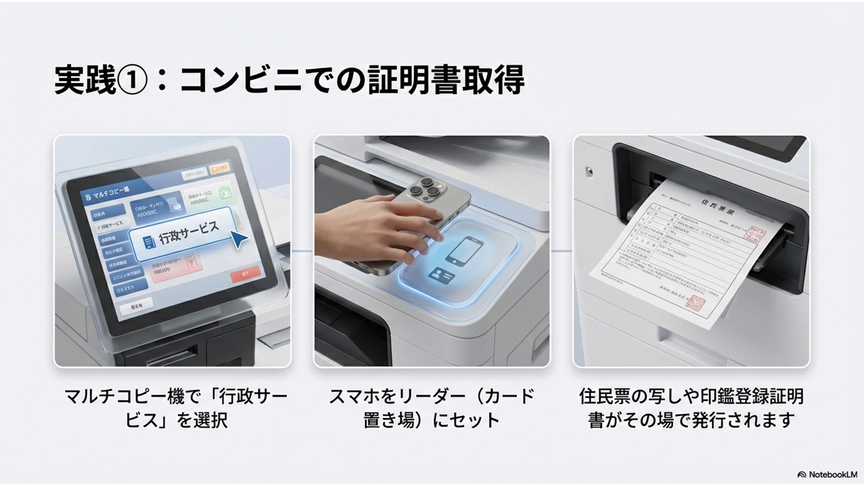 1. コンビニ交付がスマホだけで完結:住民票や印鑑証明などをいつでも取得可能。