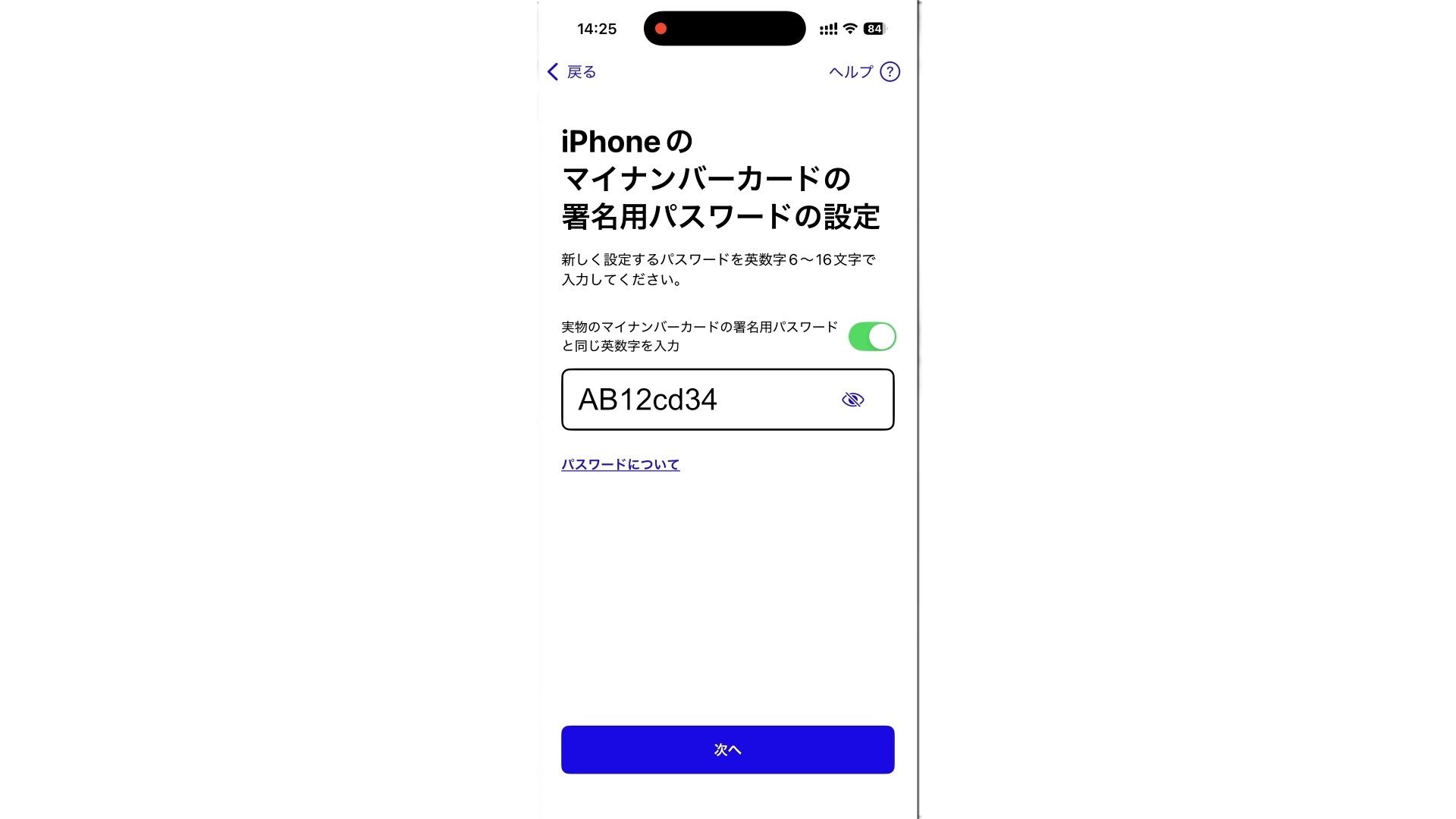 iPhone用マイナンバーカードの署名用パスワード設定画面