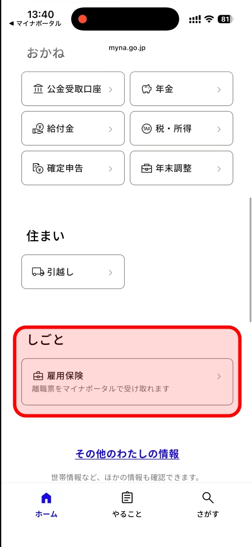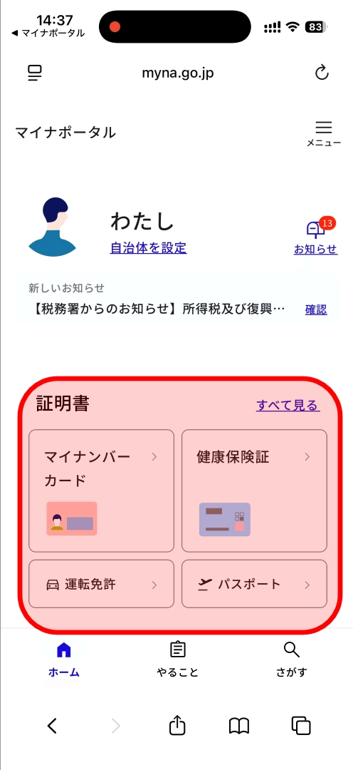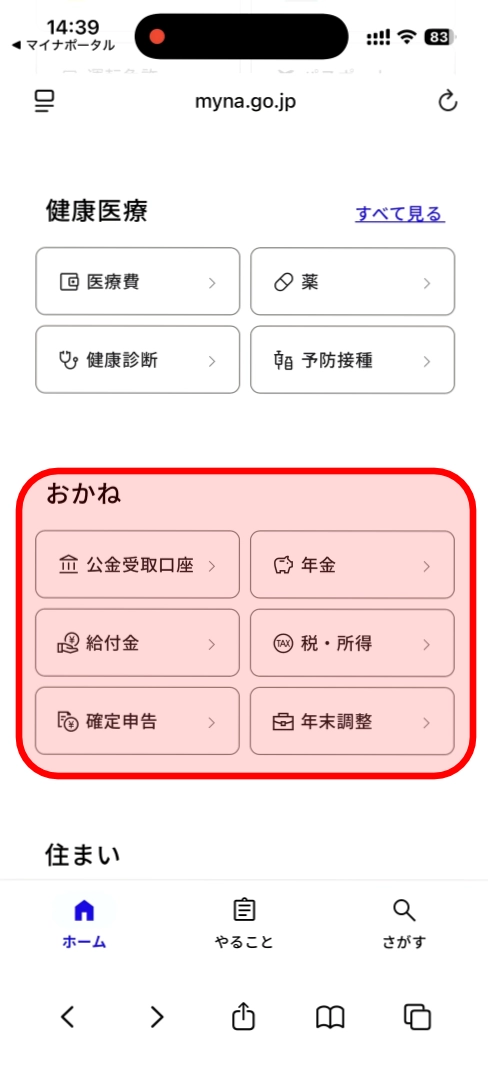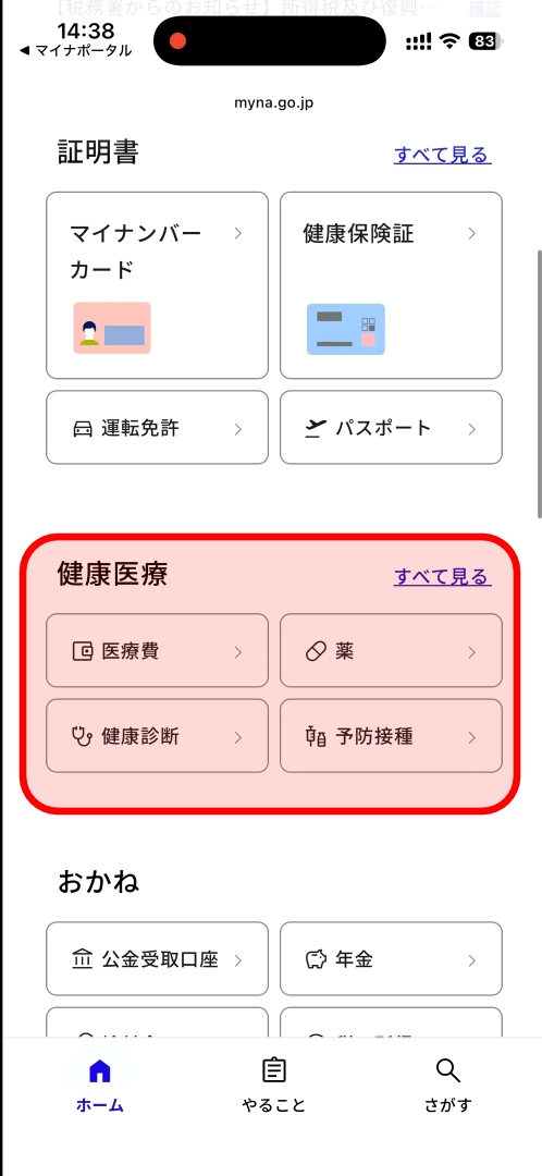 公金受取口座の登録・確認、税金や所得状況の確認もできます。