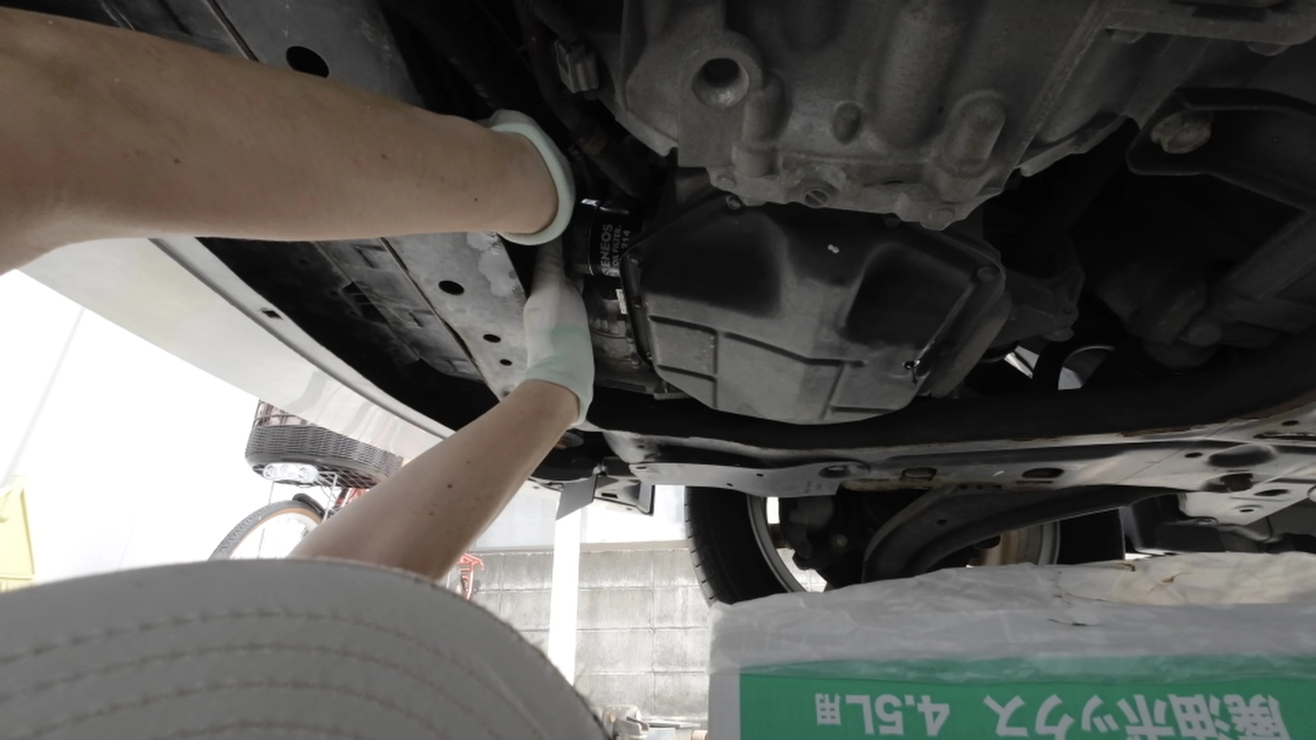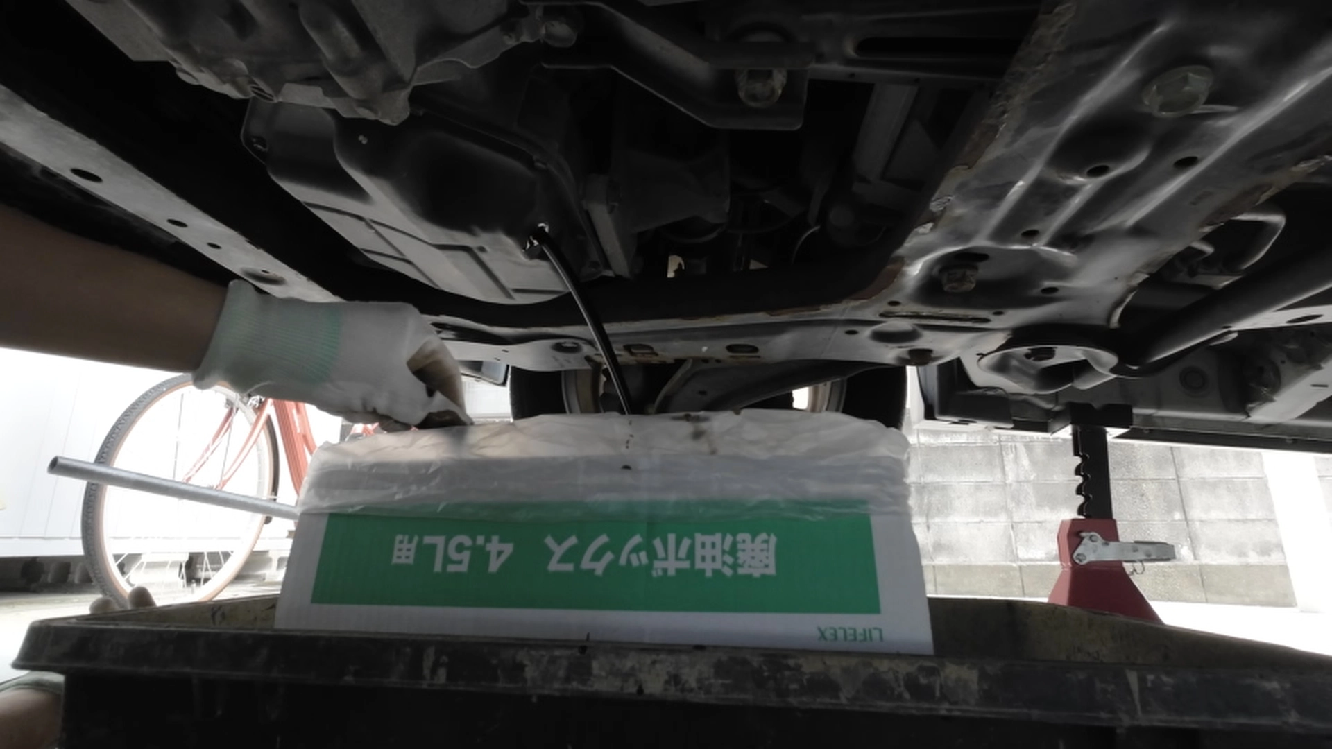 エンジンオイルの交換作業をするには、最初に車をジャッキアップして固定しないといけません。上からオイルを抜く機械を持っていればジャッキアップしなくても良いのですが、普通の人は持っていないと思います。そのためジャッキアップしてエンジン下にあるドレンボルトを空けてエンジンオイルを抜かないといけません。また、今回はエレメントも交換します。そのためエンジン下のアンダーカバーも外します。手慣れた方なら外さなくてもできるのかもしれませんが、外した方が無難だと思います。