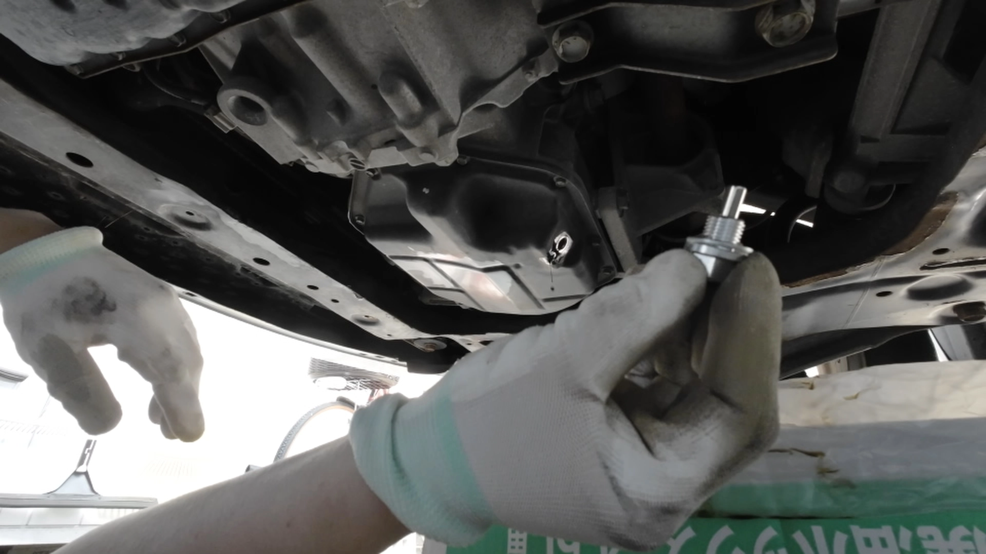 ドレンボルトを取り付けますが、今回は新しく購入した磁石付きのドレンボルトを取り付けます。最後はトルクレンチを使用して35N・mで締め付けます。取り付け後は周辺をパーツクリーナーで清掃します。