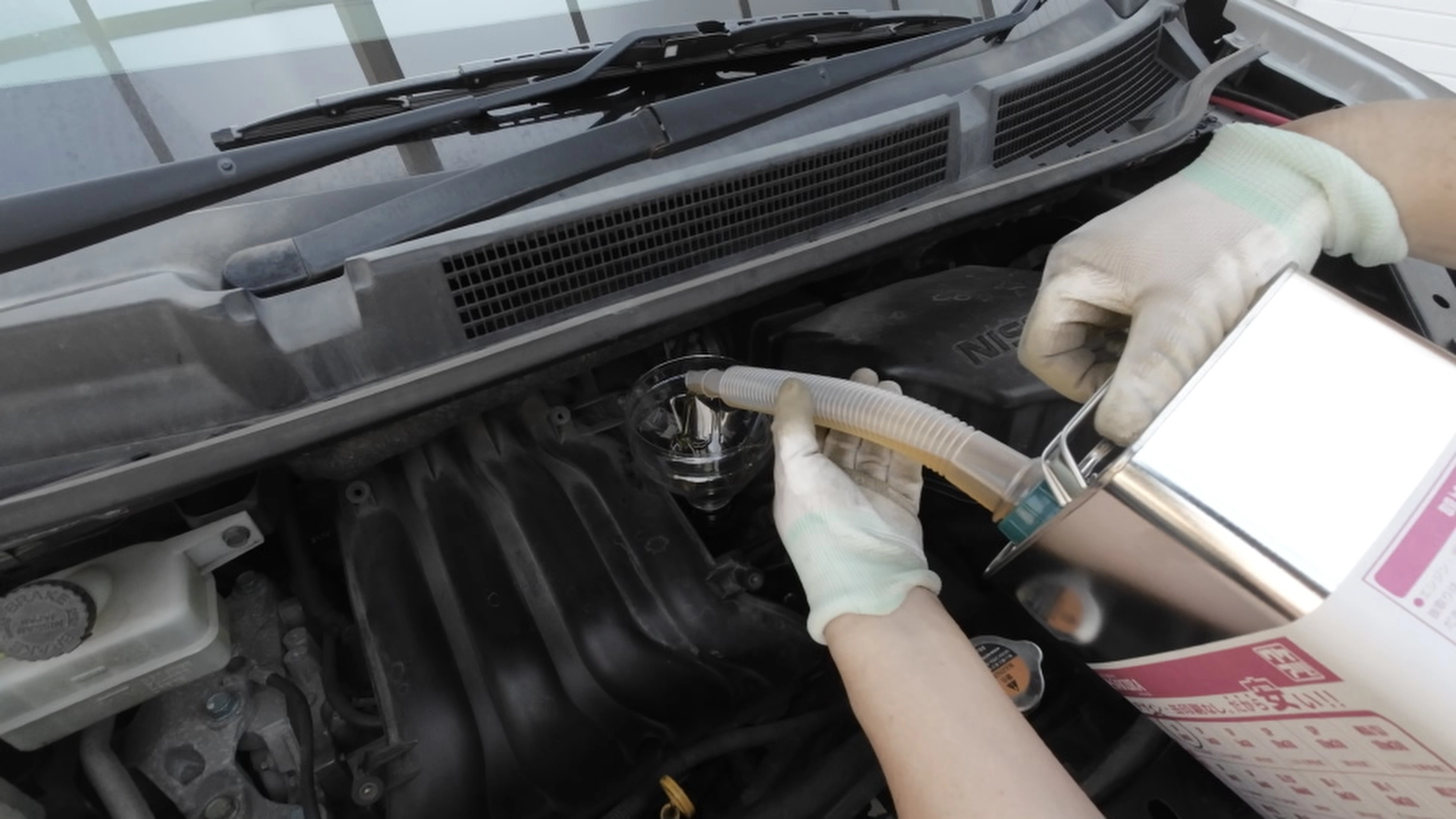 それではオイルフィラーキャップの場所からオイルを注入します。今回購入したオイル缶は4ℓなので、少し余る程度入れれば大丈夫です。